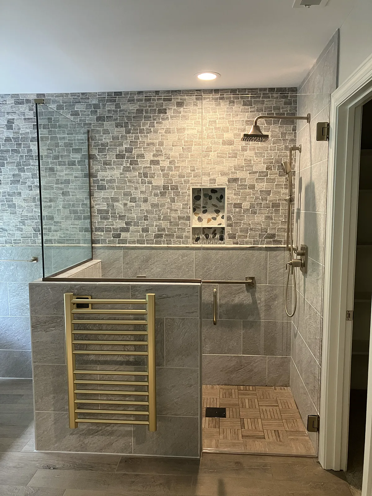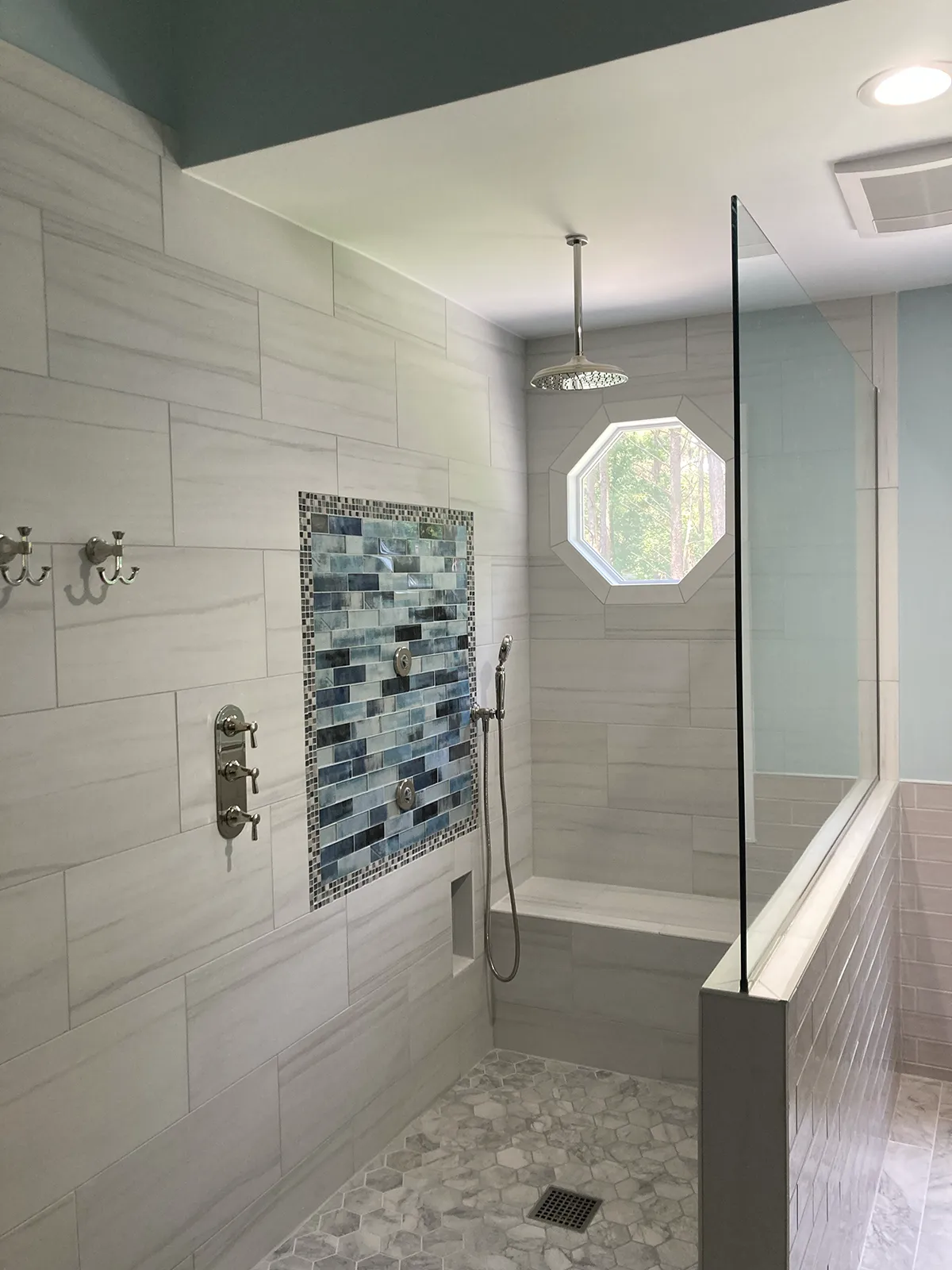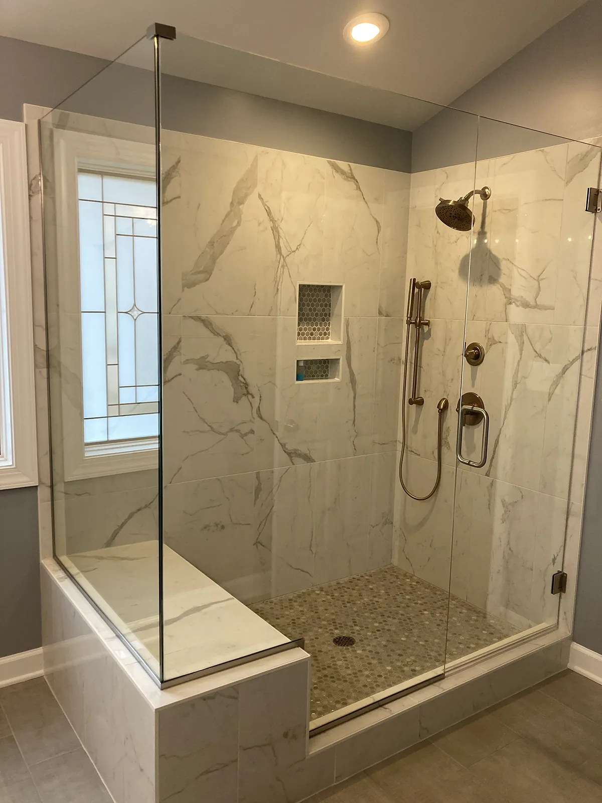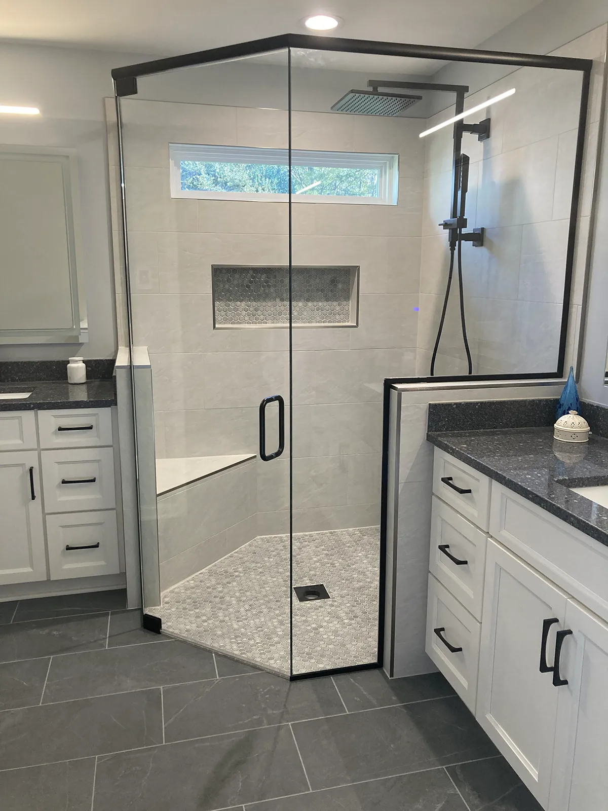 • Tiled shower with custom tiled niches and benches