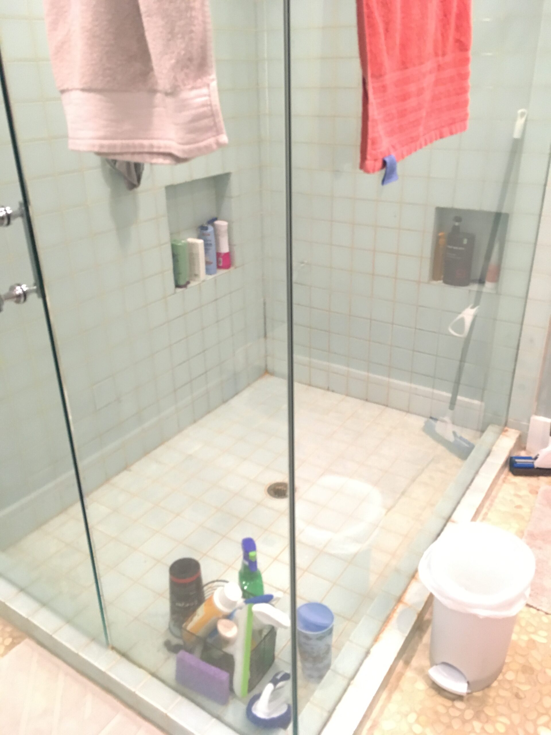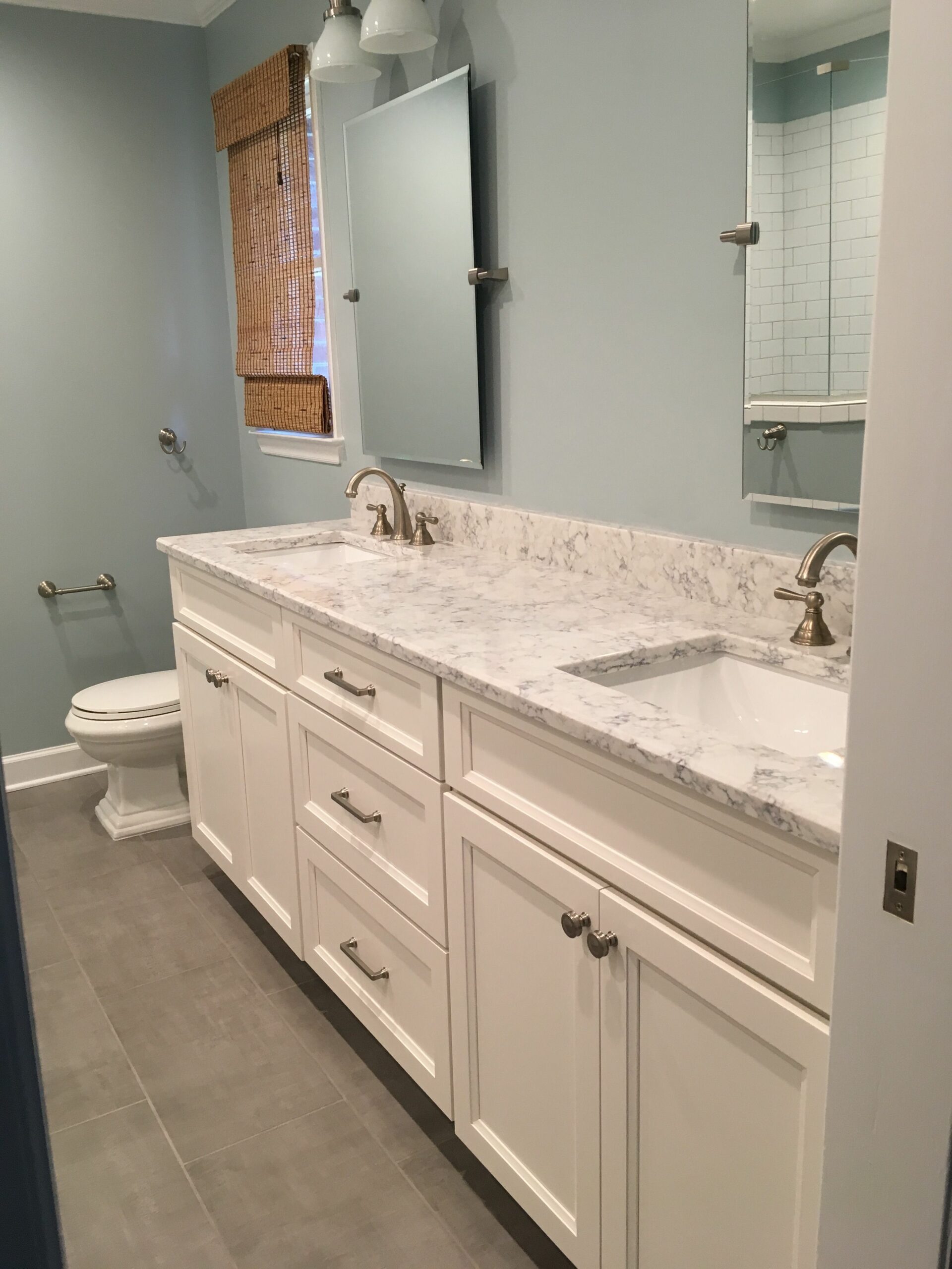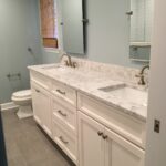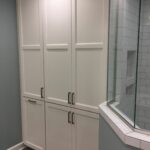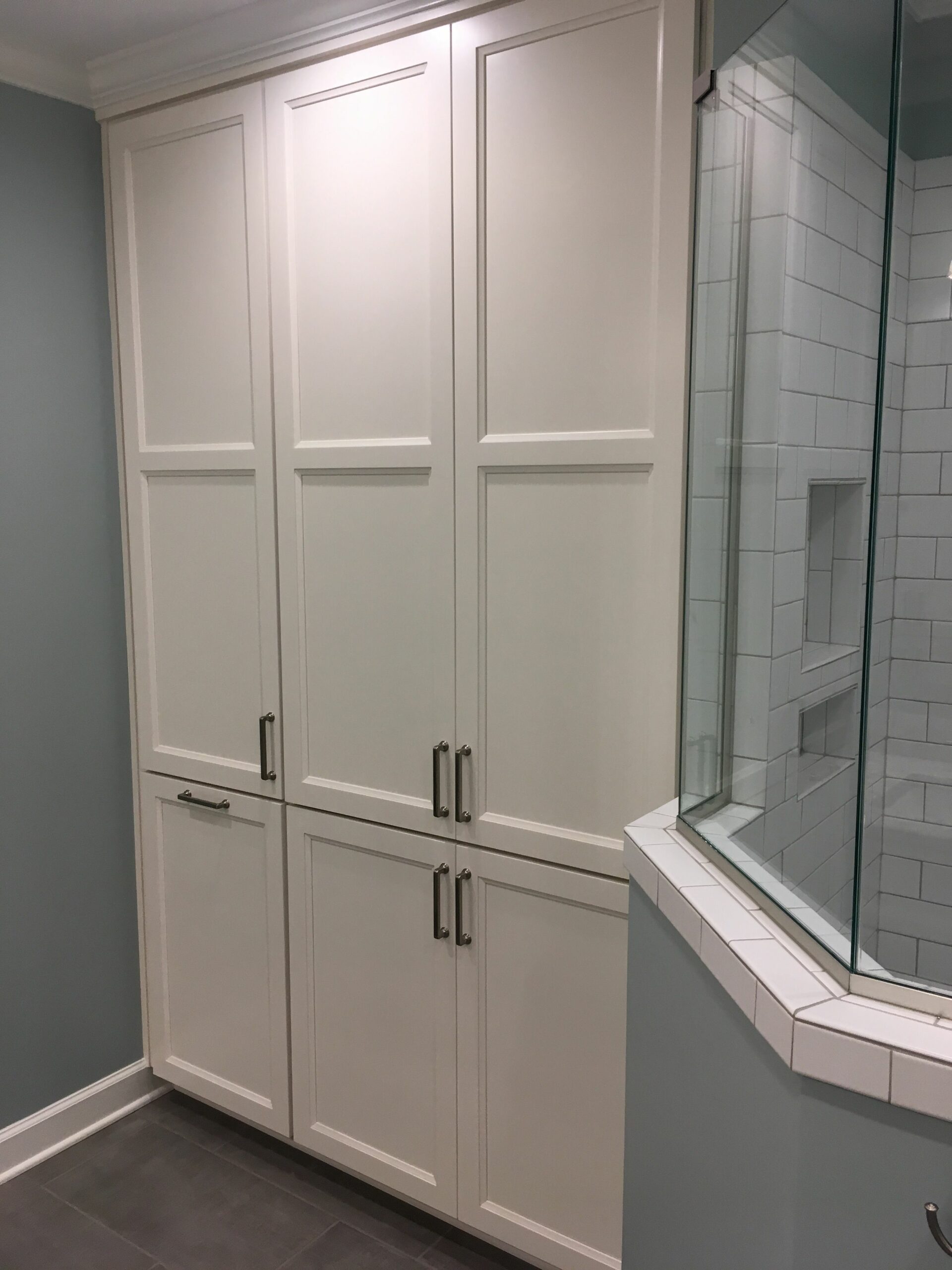 During this master bathroom renovation, we fully gutted the existing bathroom. We installed a new tiled shower with a frameless glass enclosure, full-height linen cabinets, and new vanity cabinets with quartz tops. We finished off the space with a new tile floor and all-new fixtures, lighting, and trim.