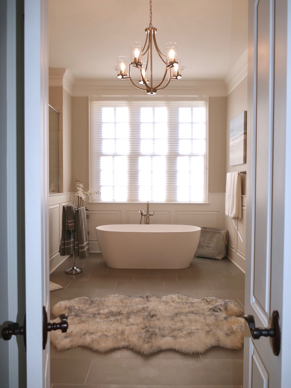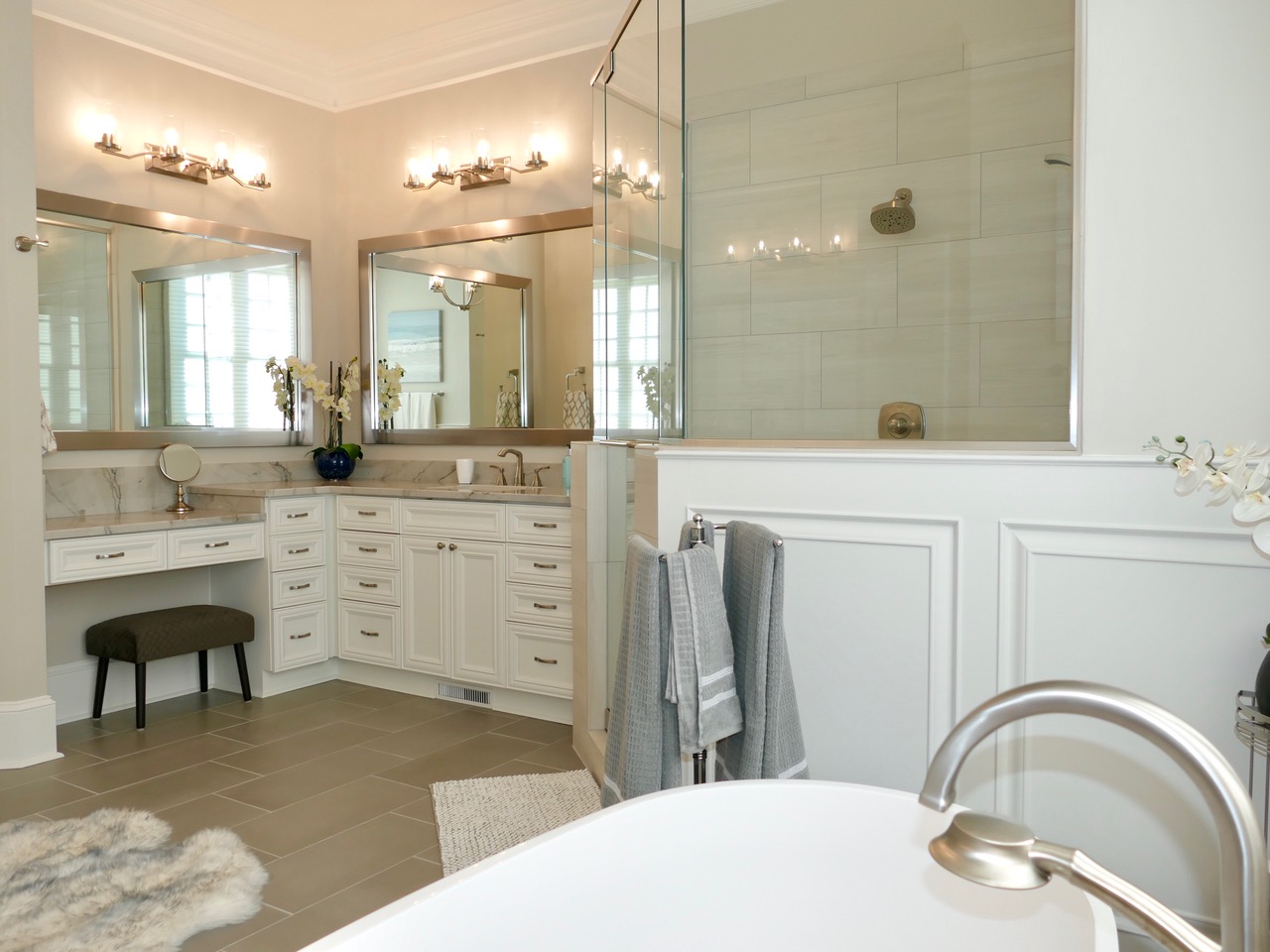 We removed the tub deck and columns, all the tile, existing glass and countertops. We added in a gorgeous free-standing tub with a wood wainscoting surround that would be sure to please any homeowner. The new shower features frameless glass, custom tile and new fixtures. The vanities got an upgrade with new stone countertops, fixtures, and lighting.